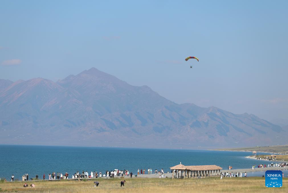 An electric paraglider is seen at Sayram Lake scenic area in Bortala Mongolian Autonomous Prefecture, northwest China's Xinjiang Uygur Autonomous Region, July 17, 2025. Nestled in the Tianshan Mountains, Sayram Lake -- Xinjiang's highest and largest alpine lake -- has emerged as a trailblazer in sustainable tourism after achieving full renewable-powered operations in July 2022. The pristine lake, a key ecological and cultural asset, has seen visitor numbers climb steadily ever since.