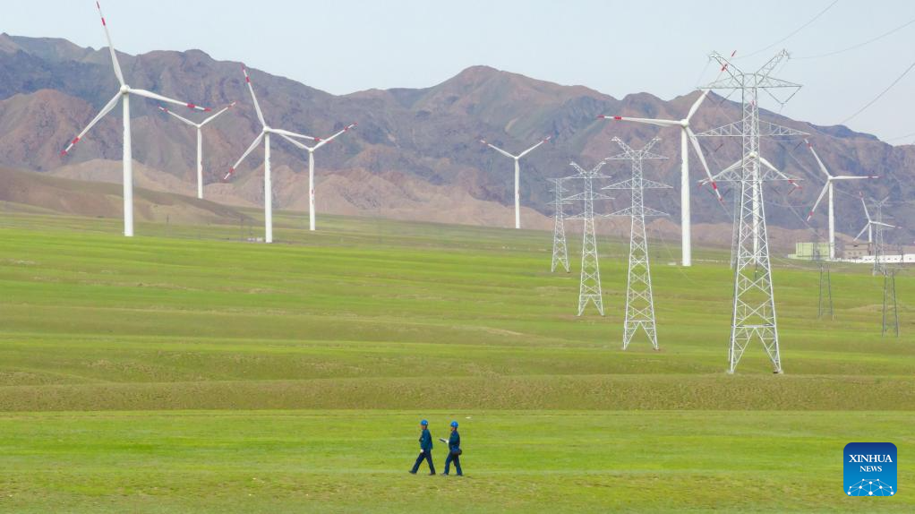 A drone photo shows staff members of State Grid Bortala Electric Power Supply Company patrolling near Sayram Lake scenic area to ensure power supply in Bortala Mongolian Autonomous Prefecture, northwest China's Xinjiang Uygur Autonomous Region, July 17, 2025. Nestled in the Tianshan Mountains, Sayram Lake -- Xinjiang's highest and largest alpine lake -- has emerged as a trailblazer in sustainable tourism after achieving full renewable-powered operations in July 2022. The pristine lake, a key ecological and cultural asset, has seen visitor numbers climb steadily ever since.