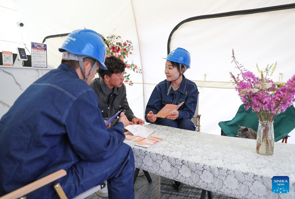 Staff members of State Grid Bortala Electric Power Supply Company communicate with a campsite worker at Sayram Lake scenic area in Bortala Mongolian Autonomous Prefecture, northwest China's Xinjiang Uygur Autonomous Region, July 16, 2025. Nestled in the Tianshan Mountains, Sayram Lake -- Xinjiang's highest and largest alpine lake -- has emerged as a trailblazer in sustainable tourism after achieving full renewable-powered operations in July 2022. The pristine lake, a key ecological and cultural asset, has seen visitor numbers climb steadily ever since.