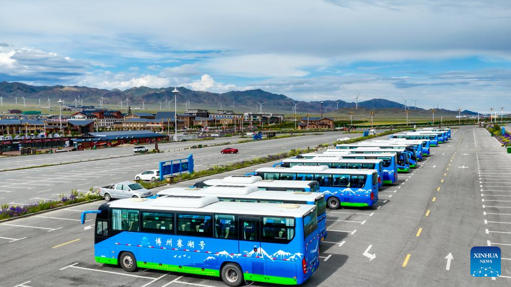 A drone photo shows the parking lot for shuttle buses at Sayram Lake scenic area in Bortala Mongolian Autonomous Prefecture, northwest China's Xinjiang Uygur Autonomous Region, July 17, 2025. Nestled in the Tianshan Mountains, Sayram Lake -- Xinjiang's highest and largest alpine lake -- has emerged as a trailblazer in sustainable tourism after achieving full renewable-powered operations in July 2022. The pristine lake, a key ecological and cultural asset, has seen visitor numbers climb steadily ever since.