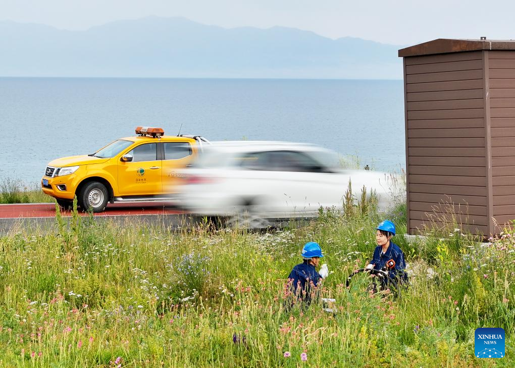 Staff members of State Grid Bortala Electric Power Supply Company patrol at Sayram Lake scenic area to ensure power supply in Bortala Mongolian Autonomous Prefecture, northwest China's Xinjiang Uygur Autonomous Region, July 16, 2025. Nestled in the Tianshan Mountains, Sayram Lake -- Xinjiang's highest and largest alpine lake -- has emerged as a trailblazer in sustainable tourism after achieving full renewable-powered operations in July 2022. The pristine lake, a key ecological and cultural asset, has seen visitor numbers climb steadily ever since.