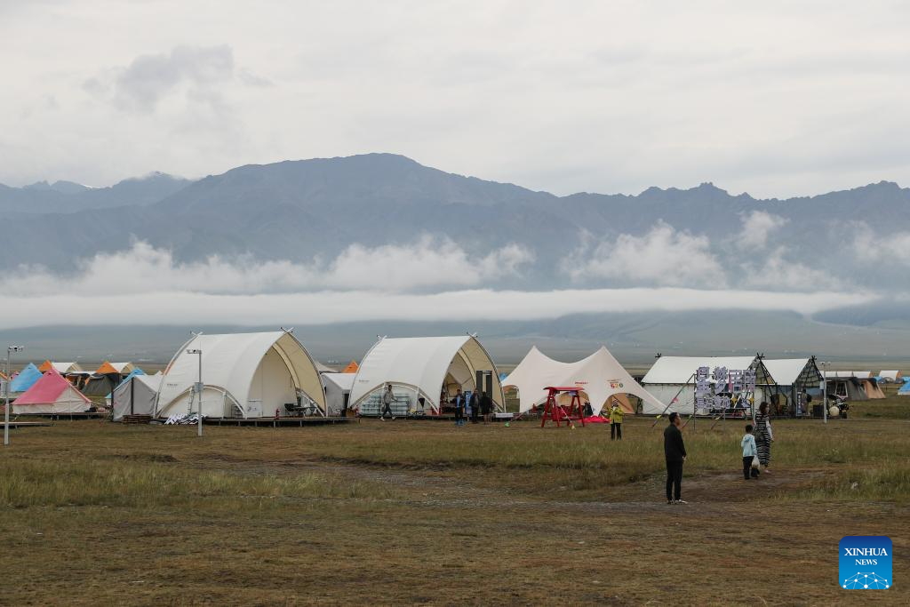 This photo shows a low-carbon campsite at Sayram Lake scenic area in Bortala Mongolian Autonomous Prefecture, northwest China's Xinjiang Uygur Autonomous Region, July 16, 2025. Nestled in the Tianshan Mountains, Sayram Lake -- Xinjiang's highest and largest alpine lake -- has emerged as a trailblazer in sustainable tourism after achieving full renewable-powered operations in July 2022. The pristine lake, a key ecological and cultural asset, has seen visitor numbers climb steadily ever since.