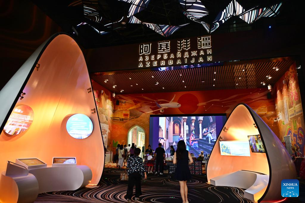 People visit the pavilion of Azerbaijan during the 2025 Shanghai Cooperation Organization (SCO) International Investment and Trade Expo in Qingdao, east China's Shandong Province, July 18, 2025. Under the theme "Sharing New Opportunities, Seeking New Common Development," the expo kicked off on Friday in Qingdao. (Xinhua/Li Ziheng)