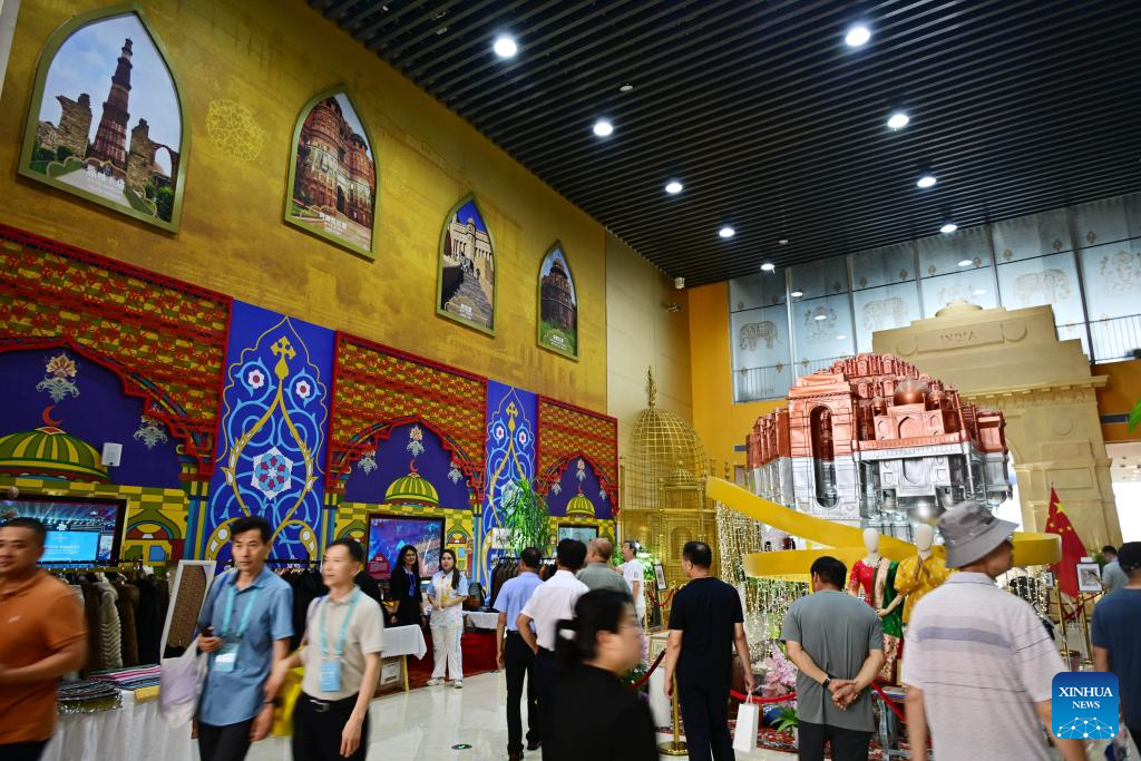 People visit the pavilion of India during the 2025 Shanghai Cooperation Organization (SCO) International Investment and Trade Expo in Qingdao, east China's Shandong Province, July 18, 2025. Under the theme "Sharing New Opportunities, Seeking New Common Development," the expo kicked off on Friday in Qingdao. (Xinhua/Li Ziheng)