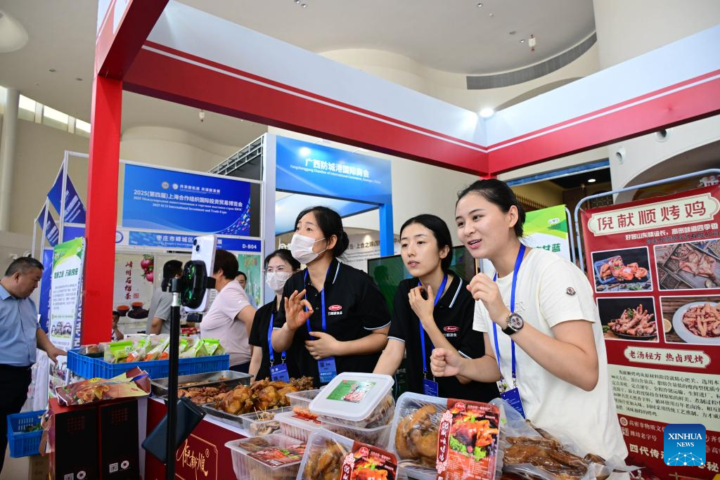 Exhibitors promote products via live-streaming during the 2025 Shanghai Cooperation Organization (SCO) International Investment and Trade Expo in Qingdao, east China's Shandong Province, July 18, 2025. Under the theme "Sharing New Opportunities, Seeking New Common Development," the expo kicked off on Friday in Qingdao. (Xinhua/Li Ziheng)