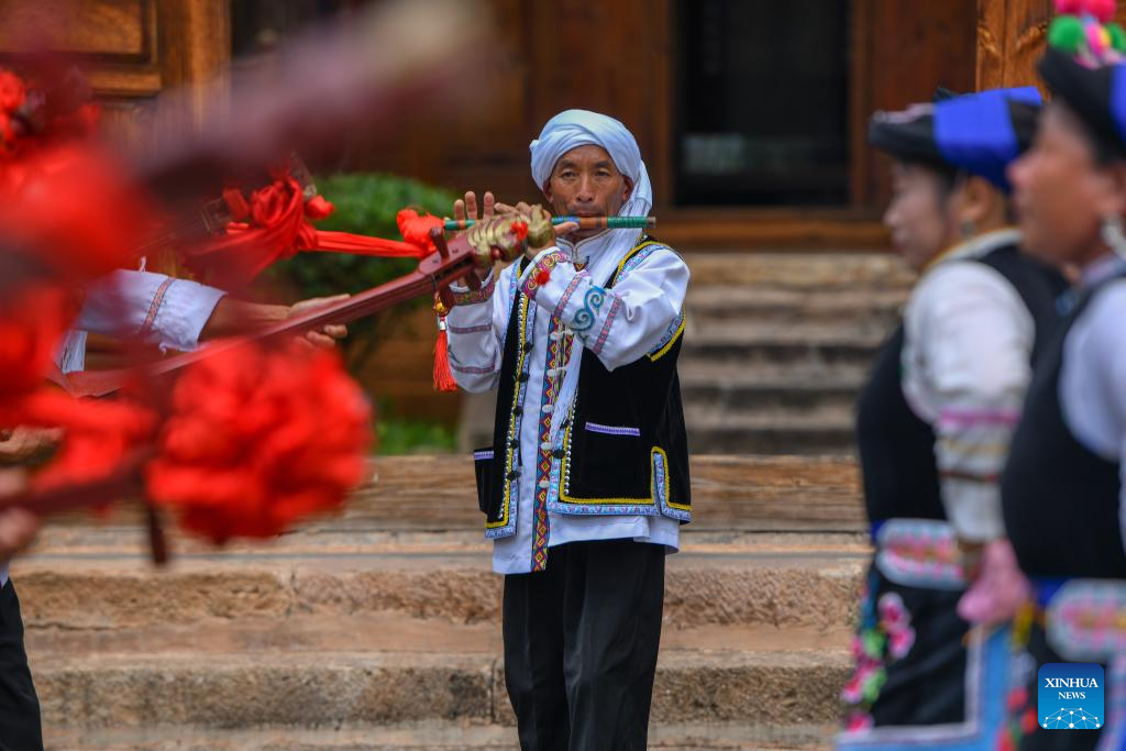 Members of a local Yizu Dage team perform during a parade show on the ancient street of Nanzhao in Weishan Yi and Hui Autonomous County, Dali Bai Autonomous Prefecture, southwest China's Yunnan Province, July 18, 2025. Yizu Dage, a traditional folk art of the Yi ethnic group usually performed during festivals, weddings, funerals and other gathering occasions, has a history of about 10 centuries and was listed as a national-level intangible cultural heritage in 2008. Weishan is dubbed "cradle of Yizu Dage."