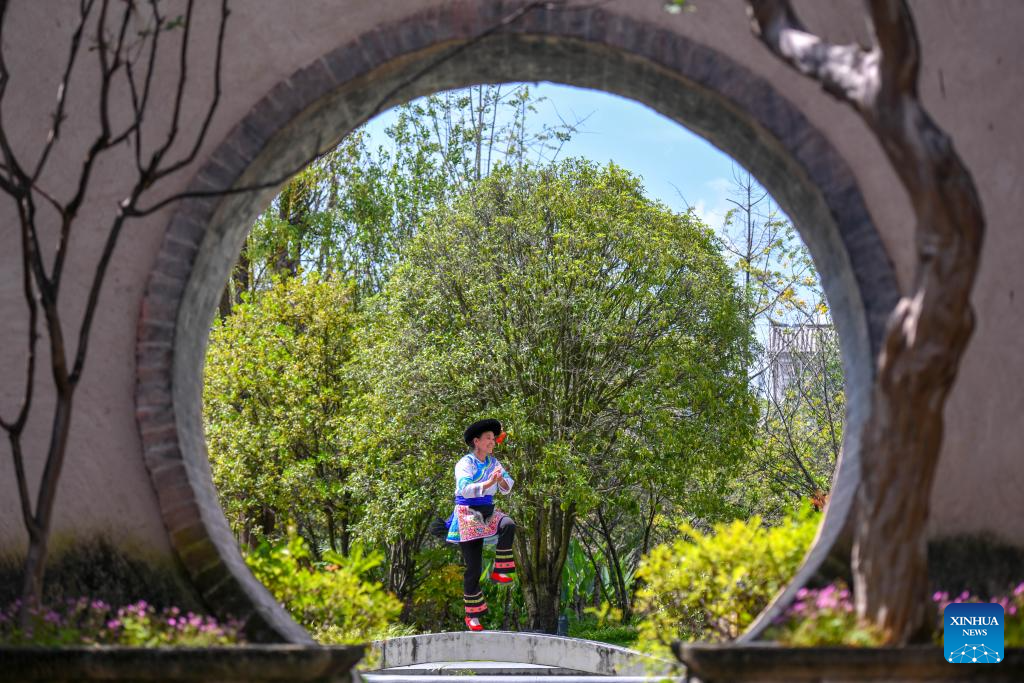 A tourist in traditional costume of Yi ethnic group tries Yizu Dage on a square in Weishan Yi and Hui Autonomous County, Dali Bai Autonomous Prefecture, southwest China's Yunnan Province, July 18, 2025. Yizu Dage, a traditional folk art of the Yi ethnic group usually performed during festivals, weddings, funerals and other gathering occasions, has a history of about 10 centuries and was listed as a national-level intangible cultural heritage in 2008. Weishan is dubbed "cradle of Yizu Dage."
