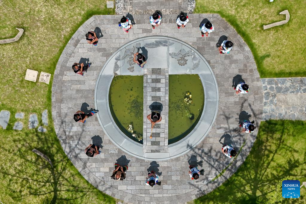 A drone photo taken on July 18, 2025 shows members of a local Yizu Dage team attending a rehearsal in Weishan Yi and Hui Autonomous County, Dali Bai Autonomous Prefecture, southwest China's Yunnan Province. Yizu Dage, a traditional folk art of the Yi ethnic group usually performed during festivals, weddings, funerals and other gathering occasions, has a history of about 10 centuries and was listed as a national-level intangible cultural heritage in 2008. Weishan is dubbed "cradle of Yizu Dage."