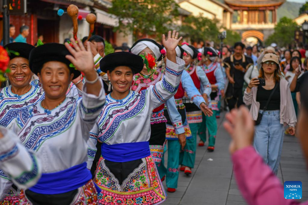 Members of a local Yizu Dage team wave to tourists during a parade show on the ancient street of Nanzhao in Weishan Yi and Hui Autonomous County, Dali Bai Autonomous Prefecture, southwest China's Yunnan Province, July 18, 2025. Yizu Dage, a traditional folk art of the Yi ethnic group usually performed during festivals, weddings, funerals and other gathering occasions, has a history of about 10 centuries and was listed as a national-level intangible cultural heritage in 2008. Weishan is dubbed "cradle of Yizu Dage."