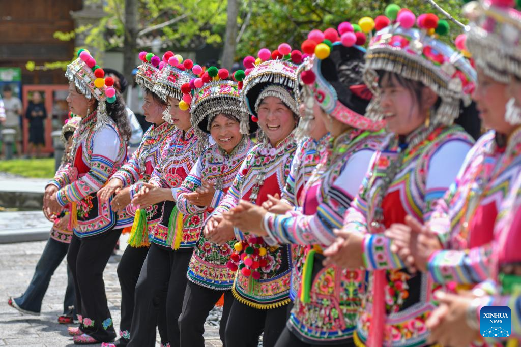 Members of a local Yizu Dage team dance with tourists during a parade show on a square in Weishan Yi and Hui Autonomous County, Dali Bai Autonomous Prefecture, southwest China's Yunnan Province, July 18, 2025. Yizu Dage, a traditional folk art of the Yi ethnic group usually performed during festivals, weddings, funerals and other gathering occasions, has a history of about 10 centuries and was listed as a national-level intangible cultural heritage in 2008. Weishan is dubbed "cradle of Yizu Dage."