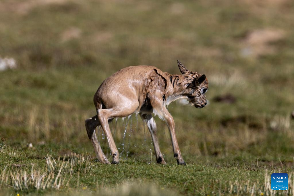 This photo taken on July 14, 2025 shows a Tibetan antelope calf in Changtang National Nature Reserve in southwest China's Xizang Autonomous Region. (Xinhua/Jiang Fan)