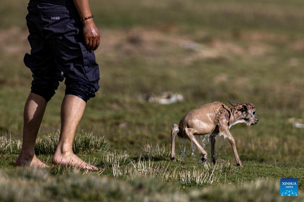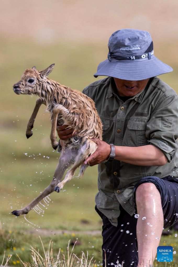 A ranger rescues a stranded Tibetan antelope calf in Changtang National Nature Reserve in southwest China's Xizang Autonomous Region, July 14, 2025. (Xinhua/Jiang Fan)