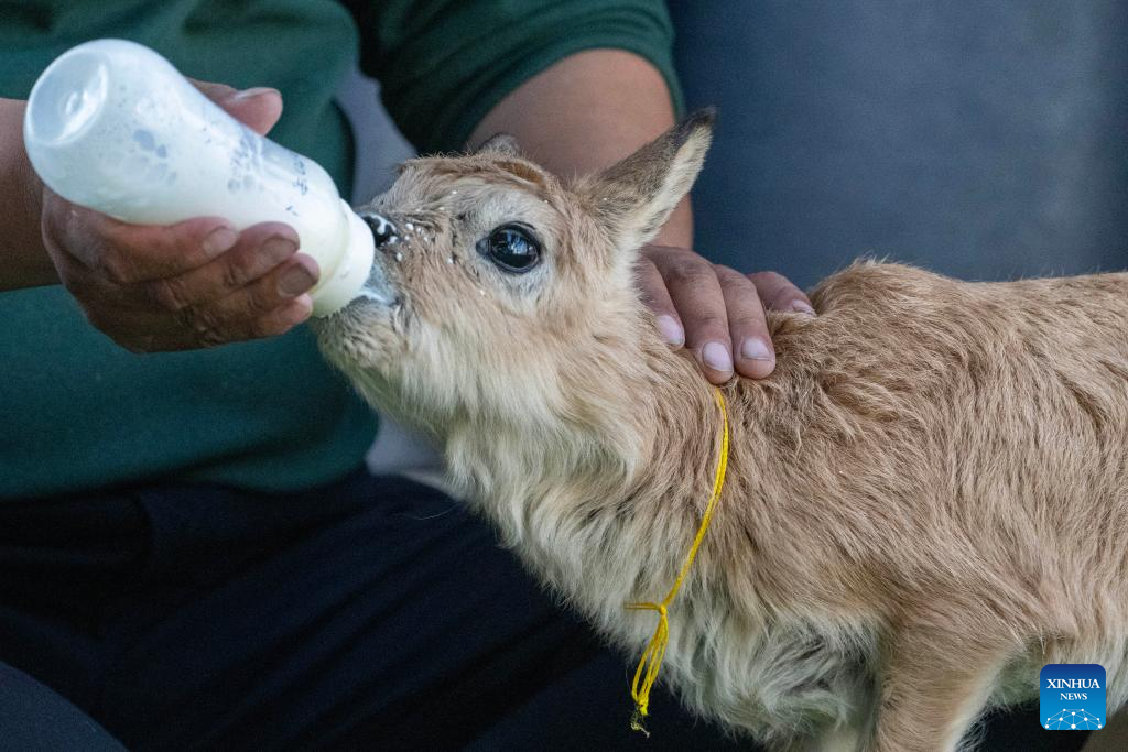 Ngawang Lodro, a staff member at a management station, feeds a Tibetan antelope calf in Changtang National Nature Reserve in southwest China's Xizang Autonomous Region, July 16, 2025. (Xinhua/Jiang Fan)