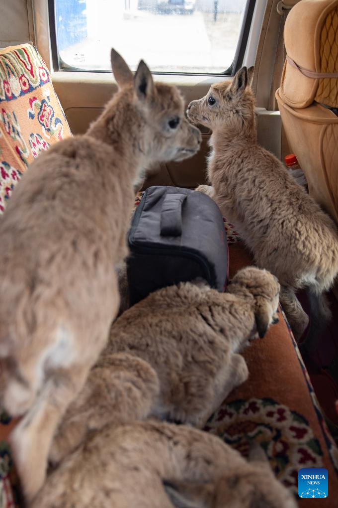 Rescued Tibetan antelope calves rest in a car in Changtang National Nature Reserve in southwest China's Xizang Autonomous Region, July 14, 2025. (Xinhua/Jiang Fan)