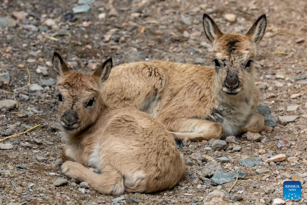 Two rescued Tibetan antelope calves rest at a management station in Changtang National Nature Reserve in southwest China's Xizang Autonomous Region, July 14, 2025. (Xinhua/Jiang Fan)