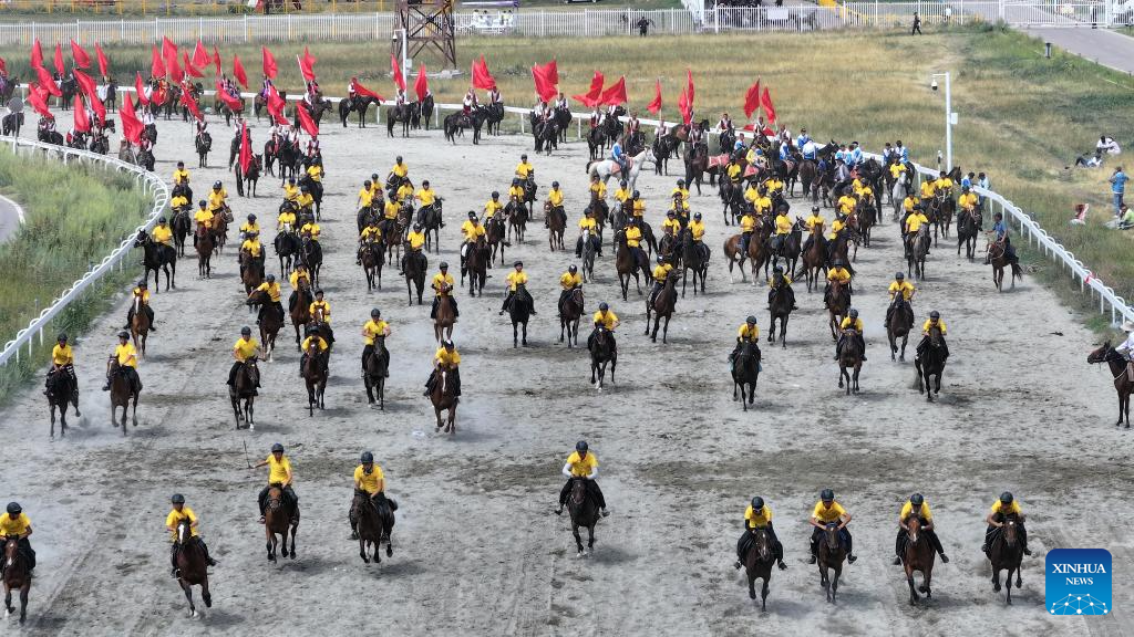An equestrian show is staged during a tourism festival in Zhaosu, northwest China's Xinjiang Uygur Autonomous Region, July 19, 2025. (Xinhua/Geng Xinning)