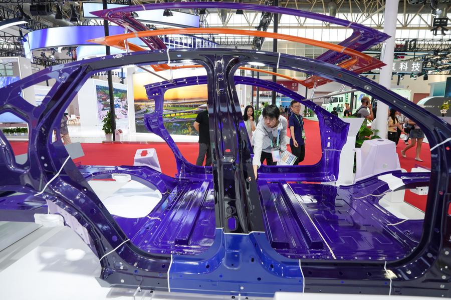 Visitors view a body structure for electric vehicles at the third China International Supply Chain Expo (CISCE) in Beijing, capital of China, July 19, 2025. (Xinhua/Ju Huanzong)