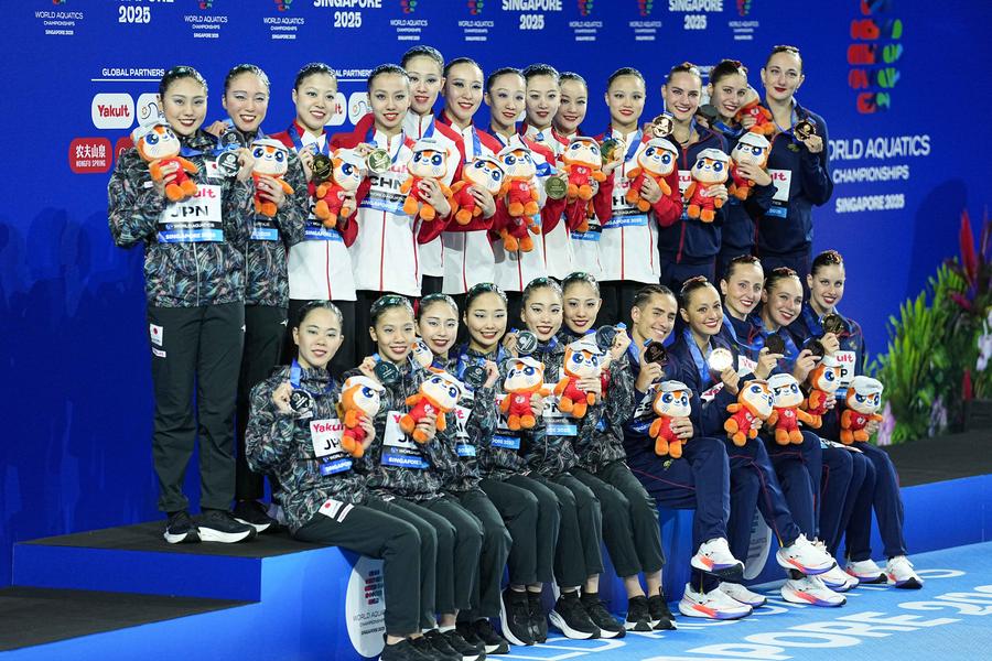 Gold medalists China (C), silver medalists Japan and bronze medalists Spain pose after the team free final of artistic swimming at the World Aquatics Championships. (Xinhua/Xue Yuge)