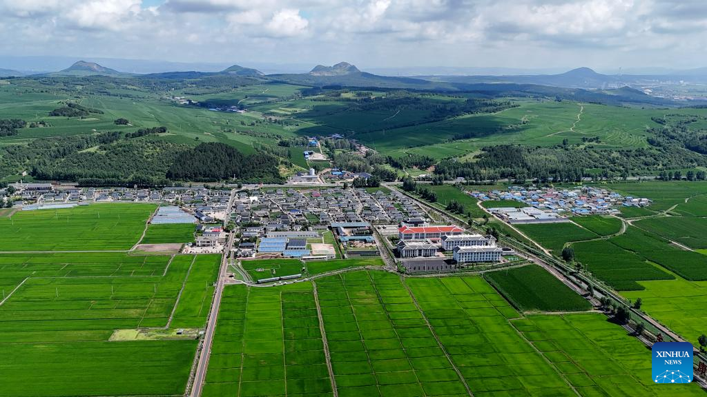 An aerial drone photo taken on July 18, 2025 shows a view of the paddy fields in Guangdong Village, Helong City, northeast China's Jilin Province. Guangdong, a border village in Jilin Province of northeast China, received over 200,000 visits in 2024, accumulating an income of over 1 million yuan (about 139,317 U.S. dollars). (Xinhua/Shao Zedong)
