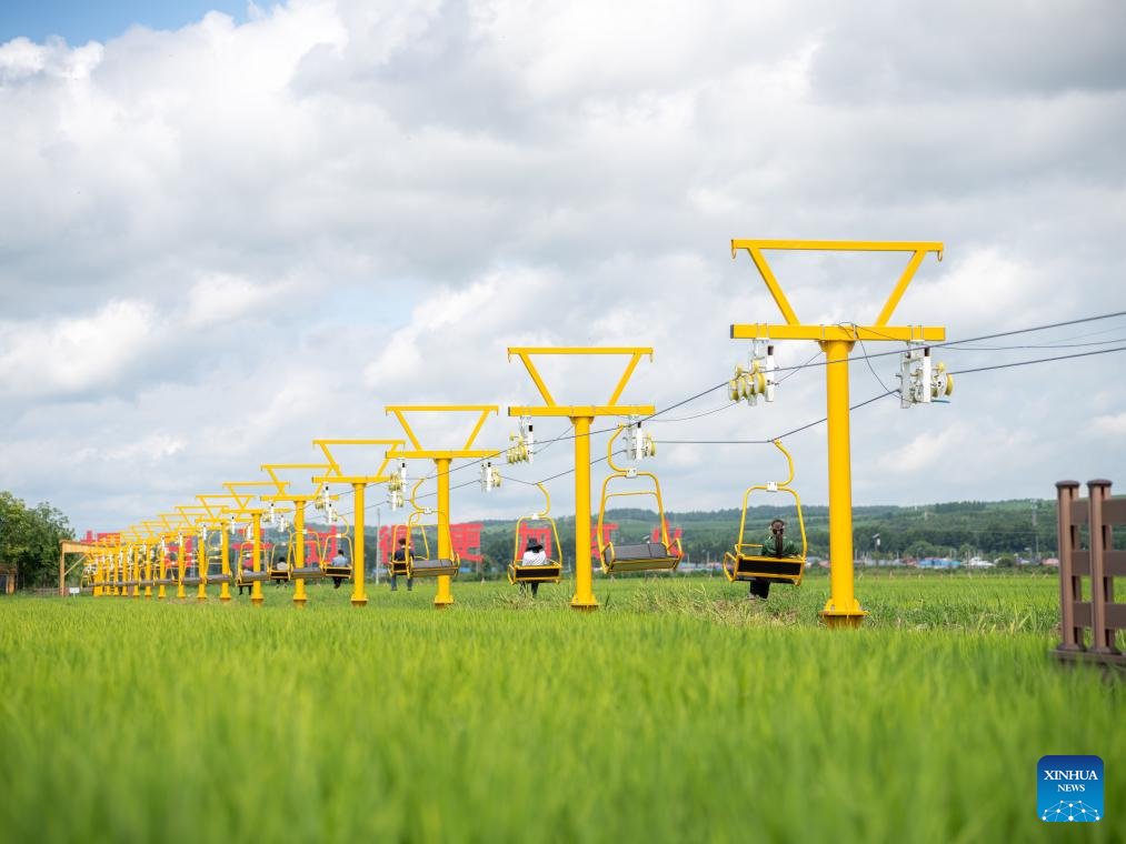 Visitors taking cable cars enjoy scenery of the paddy fields in Guangdong Village, Helong City, northeast China's Jilin Province, July 18, 2025. Guangdong, a border village in Jilin Province of northeast China, received over 200,000 visits in 2024, accumulating an income of over 1 million yuan (about 139,317 U.S. dollars). (Xinhua/Shao Zedong)