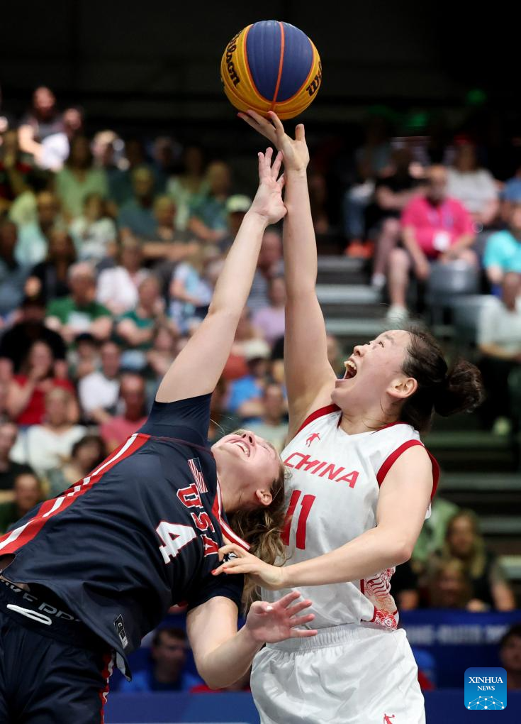 Zhang Tao (R) of China fights for the ball with Cecelia Mary Collins of the United States during the women's 3X3 basketball semifinal between China and the United States at Rhine-Ruhr 2025 FISU World University Games in Bochum, Germany, July 20, 2025. (Xinhua/Zhang Chen)