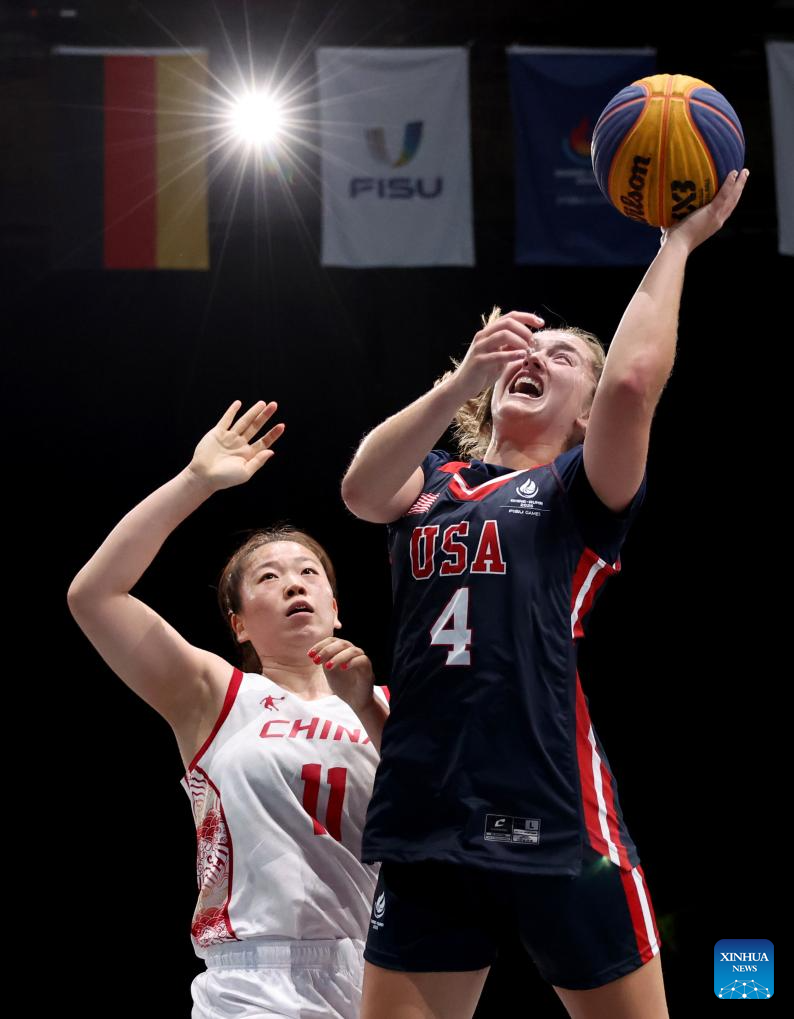 Cecelia Mary Collins (R) of the United States shoots during the women's 3X3 basketball semifinal between China and the United States at Rhine-Ruhr 2025 FISU World University Games in Bochum, Germany, July 20, 2025. (Xinhua/Zhang Chen)