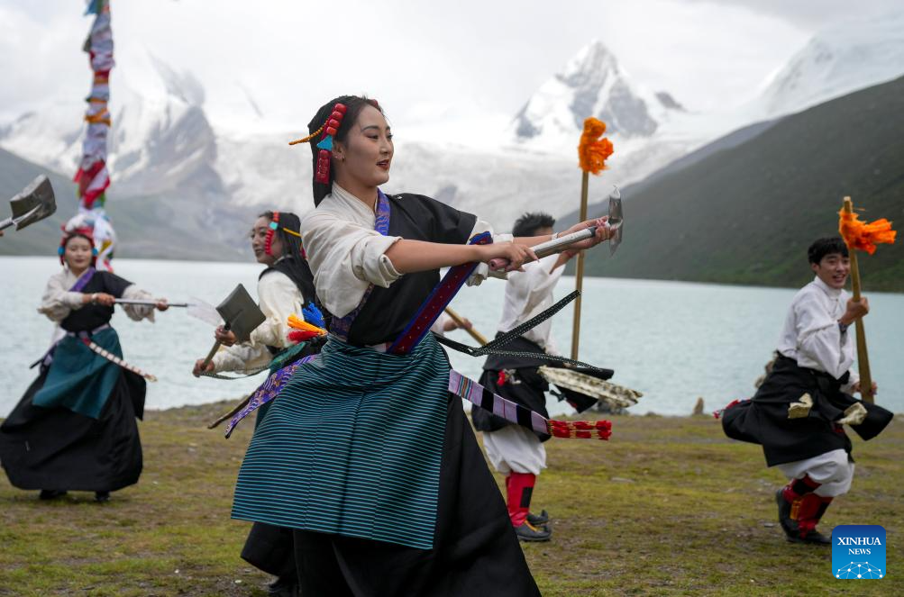 Actors of the art troupe of Biru County perform the traditional Dakpo Axie dance, a national intangible cultural heritage, at the Sapukonglagabo Mountain scenic area in Biru County, Nagqu City, southwest China's Xizang Autonomous Region, July 19, 2025. This is the sixth intangible cultural heritage performance staged by the art troupe at the scenic area this year. In recent years, Nagqu City has actively promoted the integration of intangible cultural heritage with tourism. Visitors now have more chances to watch on-site intangible cultural heritage performances at scenic areas during holidays and tourism peak season. (Xinhua/Jigme Dorje)