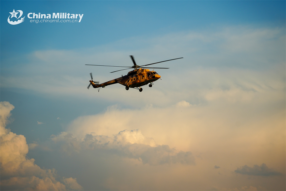 A Mi-171 transport helicopter attached to a brigade under the Chinese PLA Xinjiang Military Command flies in the sky during a flight training exercise on July 5, 2025. (eng.chinamil.com.cn/Photo by Ji Jiantao)