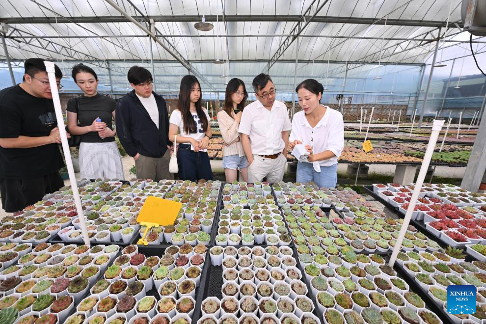 Liu Lin (1st R) introduces the succulent seedlings to visitors at the succulent seedling nursery of her company in Zhouning County, southeast China's Fujian Province, July 19, 2025. (Xinhua/Jiang Kehong)