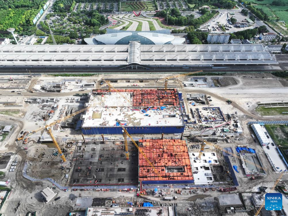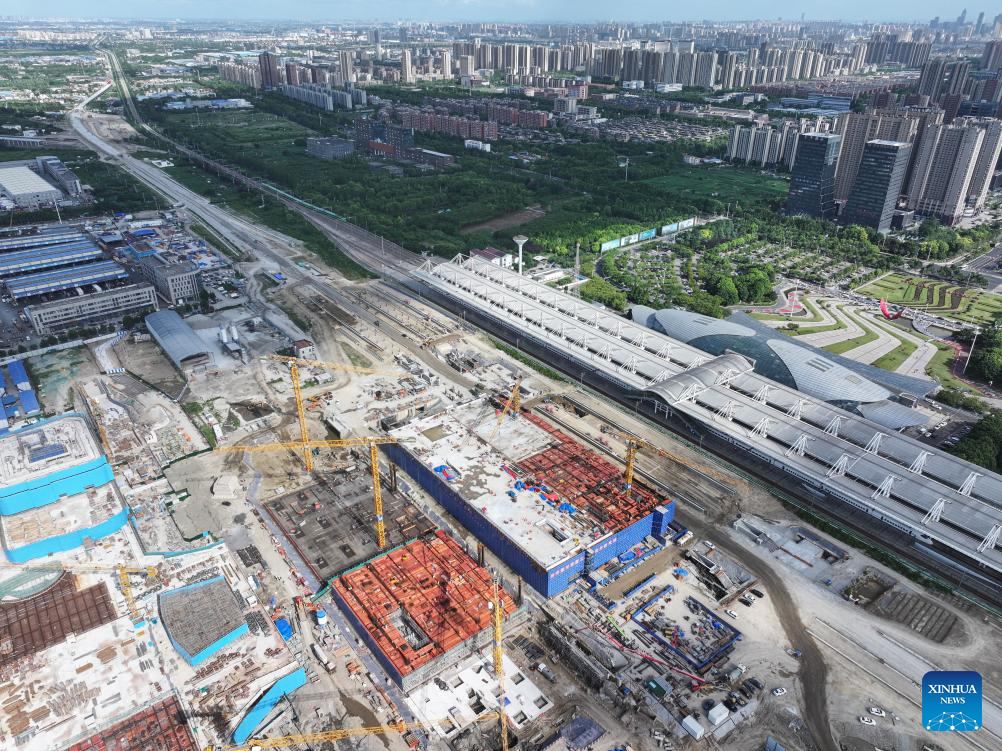 An aerial drone photo shows the construction site of the Nantong Railway Station in Nantong, east China's Jiangsu Province, July 21, 2025. The station is along a high-speed railway linking Shanghai, Nanjing of Jiangsu Province and Hefei of Anhui Province in east China. (Xinhua/Ji Chunpeng)