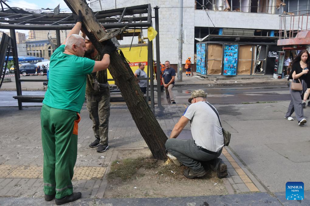Staff members saw off a burnt tree near a metro station after an air strike in the Shevchenkivskyi district of Kiev, Ukraine, July 21, 2025. Two people were killed and 15 others injured in a wave of Russian missile and drone strikes on Ukraine's capital and the western region of Ivano-Frankivsk early Monday, said Ukrainian authorities.