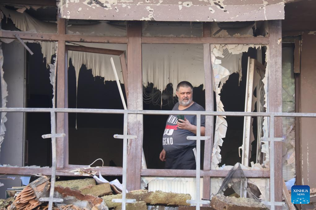 A man makes a phone call on the balcony of a damaged residential building in the Shevchenkivskyi district of Kiev, Ukraine, July 21, 2025. Two people were killed and 15 others injured in a wave of Russian missile and drone strikes on Ukraine's capital and the western region of Ivano-Frankivsk early Monday, said Ukrainian authorities.