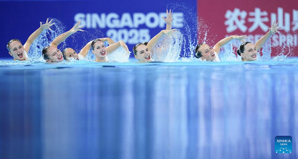 Team Ukraine perform during the team technical final of artistic swimming at the World Aquatics Championships in Singapore, July 22, 2025. (Xinhua/Xia Yifang)