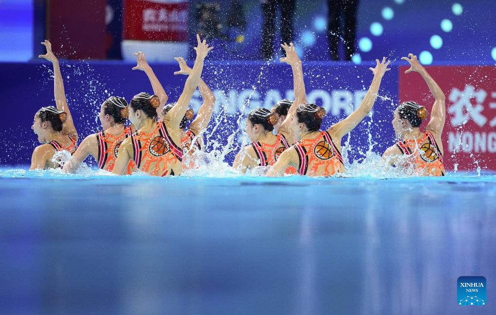Team Japan perform during the team technical final of artistic swimming at the World Aquatics Championships in Singapore, July 22, 2025. (Xinhua/Xia Yifang)