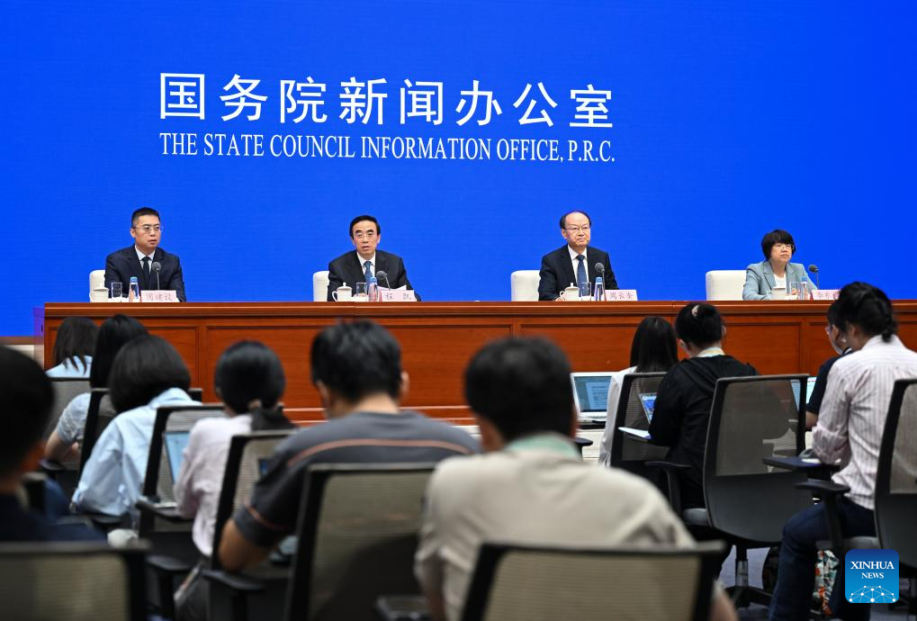 Cheng Kai, chairman of the China Disabled Persons' Federation, Zhou Changkui, secretary of the Communist Party of China leading group of the federation and chairperson of the board of executive directors of the federation, and Li Dongmei, vice chairperson of the federation, attend a press conference held by the State Council Information Office on the achievements in developing the cause of people with disabilities during the 14th Five-Year Plan period (2021-2025), in Beijing, capital of China, July 22, 2025. (Xinhua/Chen Yehua)