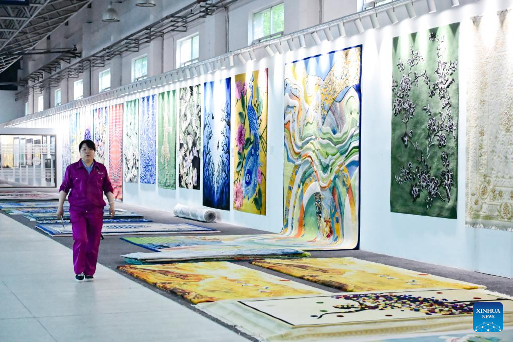 Tibetan carpets are displayed at a workshop of Shengyuan carpet group in Xining, northwest China's Qinghai Province, July 21, 2025. Located in Chengzhong District of Xining City, Shengyuan carpet group is an enterprise specializing in the design and production of Tibetan carpets. Since its establishment in 2007, the company has recruited people from surrounding areas, with 90% of its employees coming from nearby villages and including various ethnic minorities such as Tibetan and Tu ethnic groups.