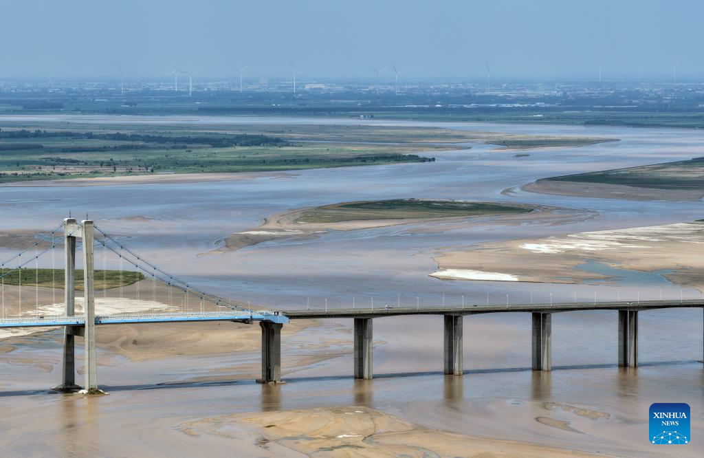 An aerial drone photo taken on July 17, 2025 shows a section of the Yellow River in Zhengzhou, central China's Henan Province. Located in central China, Zhengzhou is renowned as a regional hub for sci-tech innovation, a national historical and cultural city, and an international comprehensive transportation hub. In recent years, Zhengzhou has been dedicated to promoting high-quality development, enhancing its overall competitiveness, and integrating into the national market.