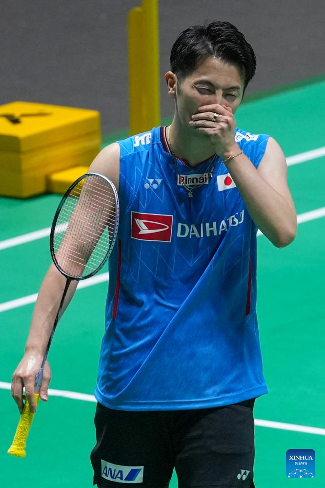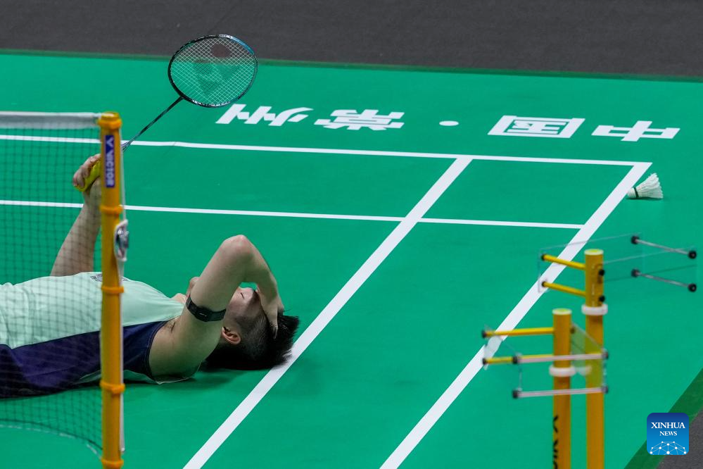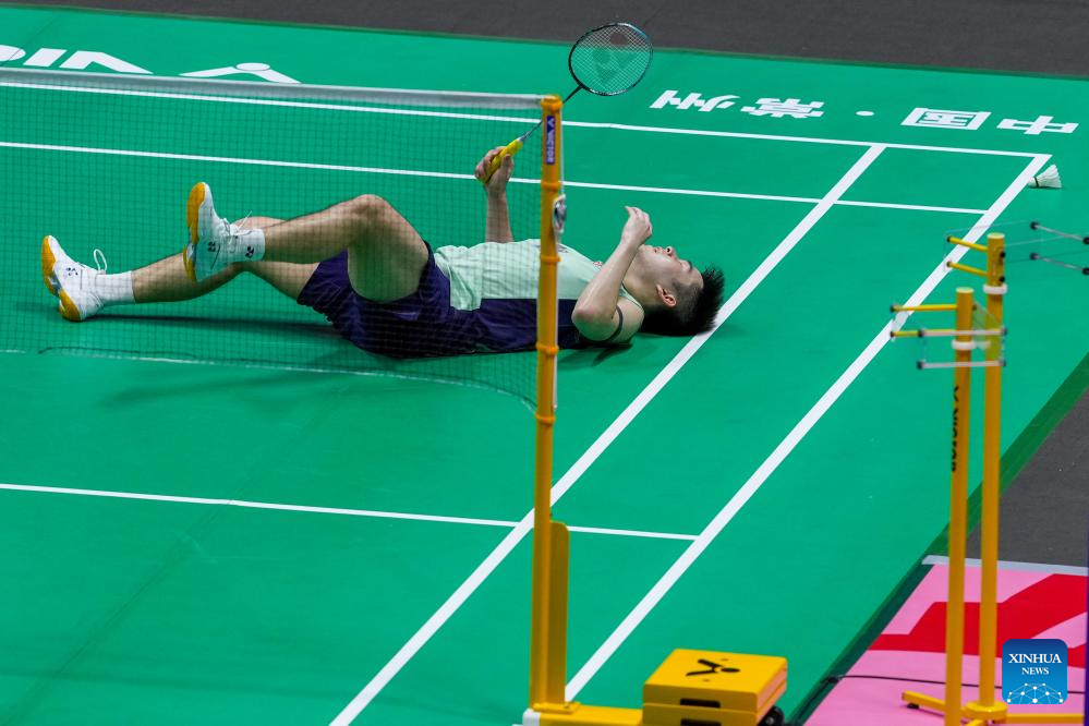 Kunlavut Vitidsarn of Thailand reacts during the men's singles round of 32 match between Kunlavut Vitidsarn of Thailand and Alwi Farhan of Indonesia at the China Open 2025 badminton tournament in Changzhou, east China's Jiangsu Province, July 22, 2025. (Xinhua/Li Bo)