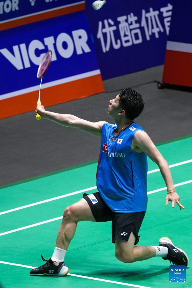 Watanabe Koki of Japan competes during the men's singles round of 32 match between Watanabe Koki of Japan and Prannoy Haseena Sunil Kumar of India at the China Open 2025 badminton tournament in Changzhou, east China's Jiangsu Province, July 22, 2025. (Xinhua/Li Bo)