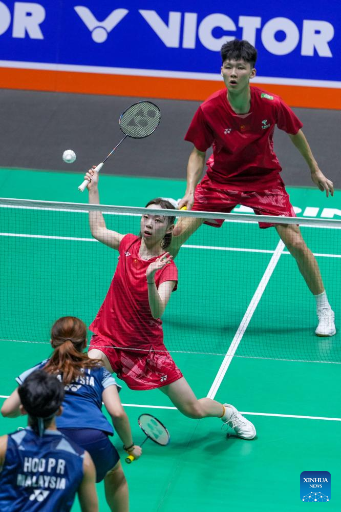 Gao Jiaxuan/Wu Mengying (2nd R) of China compete during the mixed doubles round of 32 match between Gao Jiaxuan/Wu Mengying of China and Hoo Pang Ron/Cheng Su Yin of Malaysia at the China Open 2025 badminton tournament in Changzhou, east China's Jiangsu Province, July 22, 2025. (Xinhua/Li Bo)
