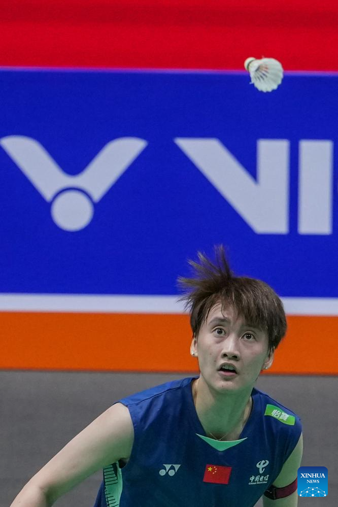 Chen Yufei of China competes during the women's singles round of 32 match between Chen Yufei of China and Kim Ga Eun of South Korea at the China Open 2025 badminton tournament in Changzhou, east China's Jiangsu Province, July 22, 2025. (Xinhua/Li Bo)