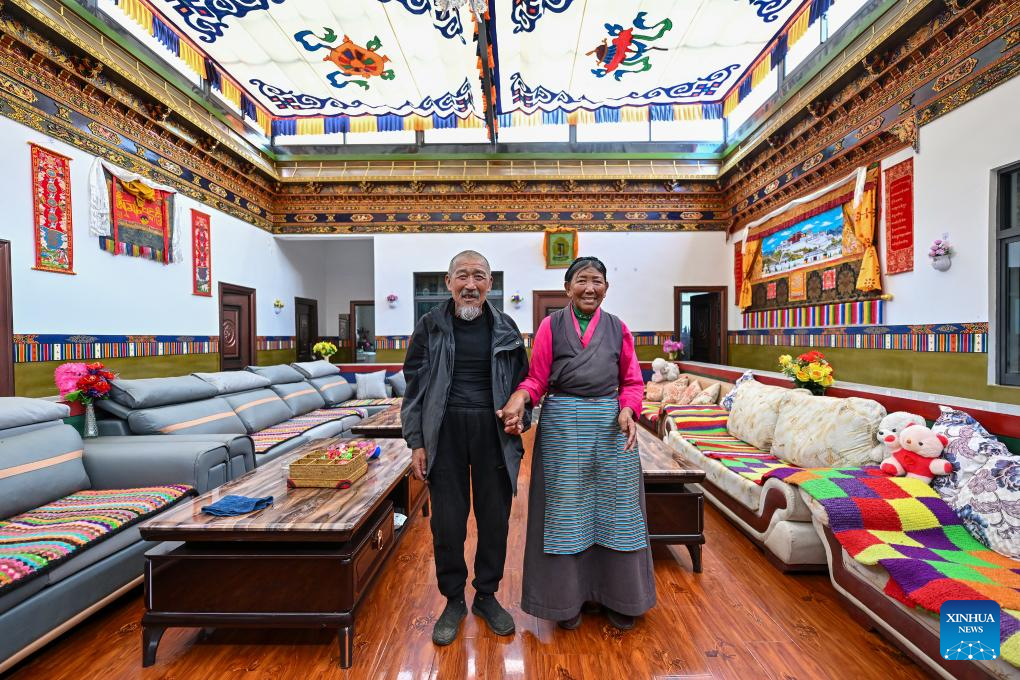Zhaxi Ngoezhub (L) and his wife Soinam Yuzhen pose for a photo at the living room of their new house in Lnadingxooi Village, Zhomda Township, Nang County of southwest China's Xizang Autonomous Region, July 21, 2025. (Xinhua/Li Xin)