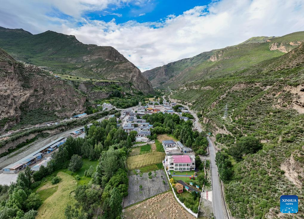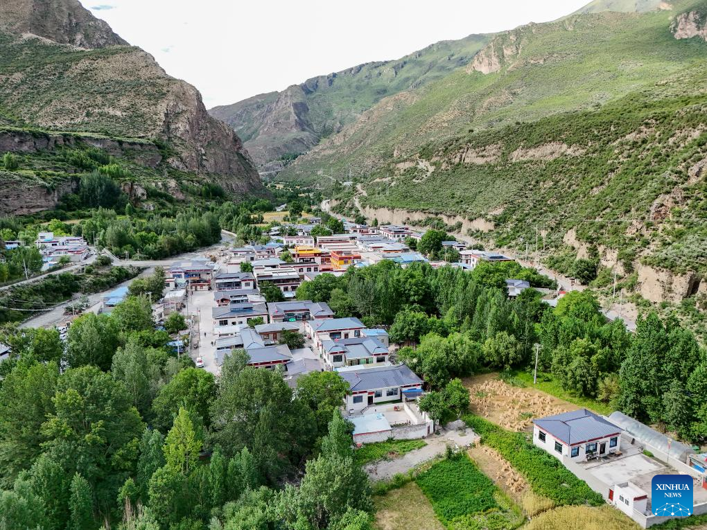 An aerial drone photo taken on July 21, 2025 shows a view of Lnadingxooi Village, Zhomda Township, Nang County of southwest China's Xizang Autonomous Region. (Xinhua/Li Xin)