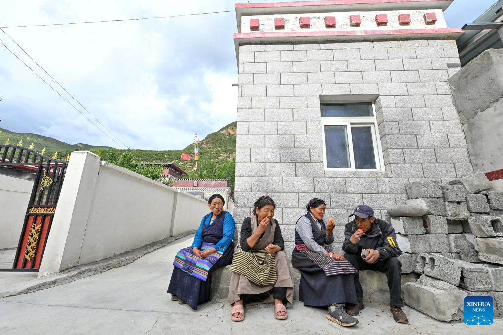 Villagers chat and eat fruits outside a house under renovation in Lnadingxooi Village, Zhomda Township, Nang County of southwest China's Xizang Autonomous Region, July 21, 2025. (Xinhua/Li Xin)