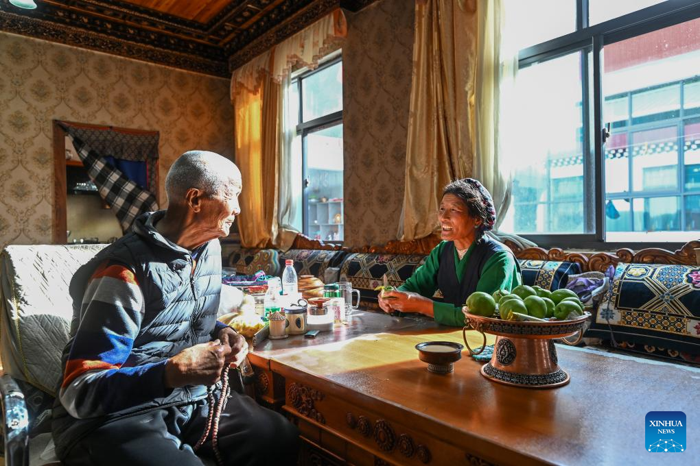Gesang Deqing (R) peels a fruit for her father at the dining room of their new house in Lnadingxooi Village, Zhomda Township, Nang County of southwest China's Xizang Autonomous Region, July 21, 2025. (Xinhua/Li Xin)