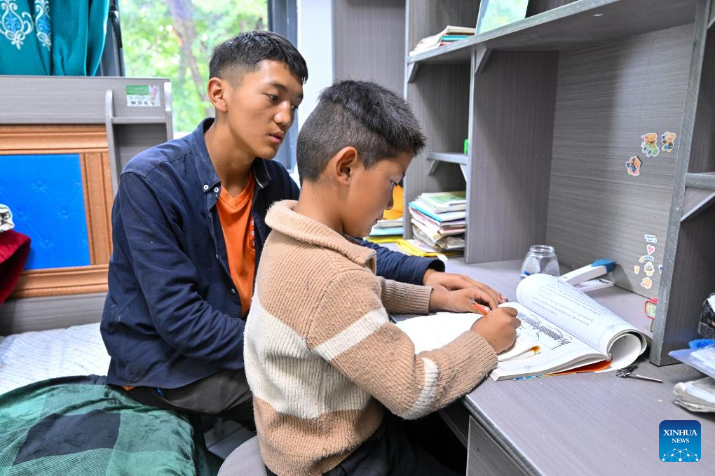 Migmar Cering (L) helps his brother on his homework at their new house in Lnadingxooi Village, Zhomda Township, Nang County of southwest China's Xizang Autonomous Region, July 21, 2025. (Xinhua/Li Xin)