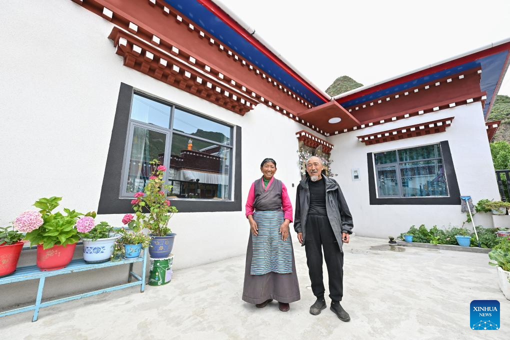 Zhaxi Ngoezhub (R) and his wife Soinam Yuzhen pose for a photo outside their new house in Lnadingxooi Village, Zhomda Township, Nang County of southwest China's Xizang Autonomous Region, July 21, 2025. (Xinhua/Li Xin)