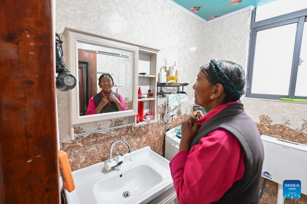 Soinam Yuzhen arranges her clothes at the restroom of her new house in Lnadingxooi Village, Zhomda Township, Nang County of southwest China's Xizang Autonomous Region, July 21, 2025. (Xinhua/Li Xin)