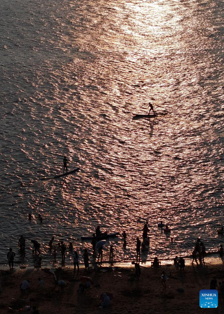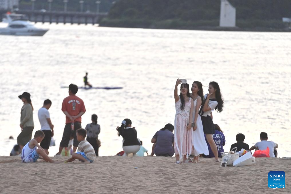 People enjoy their leisure time on a beach at a scenic area in Fangchenggang City, south China's Guangxi Zhuang Autonomous Region, July 6, 2025. Fangchenggang, named after its port, is located at the China-Vietnam border and serves as a crucial hub of the New International Land-Sea Trade Corridor. The city is also situated on the shoreline of the Beibu Gulf and features seaside tourist attractions such as piers and beaches. (Xinhua/Huang Xiaobang)