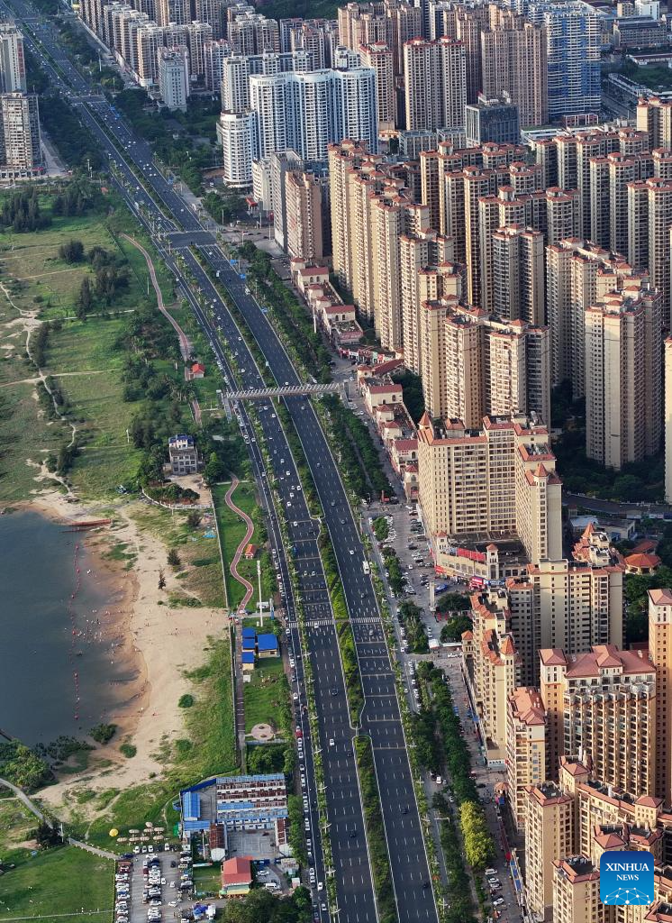 An aerial drone photo taken on July 6, 2025 shows a view of Fangchenggang City, south China's Guangxi Zhuang Autonomous Region. Fangchenggang, named after its port, is located at the China-Vietnam border and serves as a crucial hub of the New International Land-Sea Trade Corridor. The city is also situated on the shoreline of the Beibu Gulf and features seaside tourist attractions such as piers and beaches. (Xinhua/Huang Xiaobang)